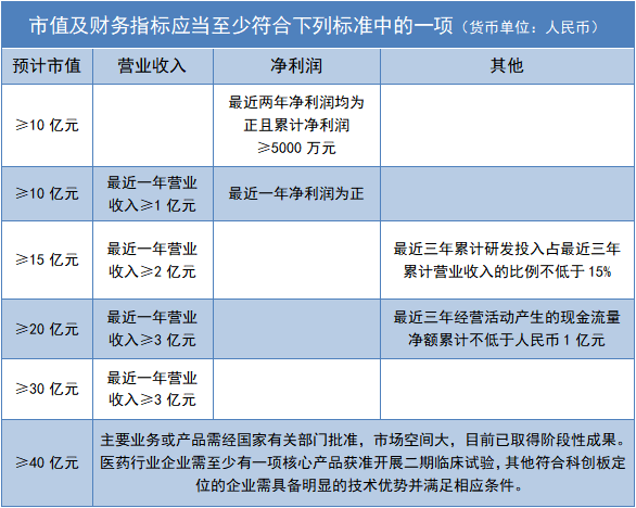 正是在這種大背景前提下,我國才決定開設(shè)科創(chuàng)板,解決科技創(chuàng)新企業(yè)的融資難問題。對科學(xué)儀器企業(yè)來說,采用注冊制的科創(chuàng)板入市門檻更低,上市效率也會更高。更重要的是,有別于傳統(tǒng)的估值方法,科創(chuàng)板不再以持續(xù)盈利為唯一目標(biāo),而是以市值為基礎(chǔ),考察研發(fā)投入、營業(yè)收入、凈利潤等多個維度的指標(biāo)。毫不夸張地說,即便企業(yè)還沒有盈利,也有機(jī)會上市。比如,預(yù)計(jì)市值大于15億,近1年?duì)I業(yè)收入大于2億,近3年研發(fā)投入合計(jì)占營業(yè)收入的比例大于15%,就可以在科創(chuàng)板上市(如下表)。