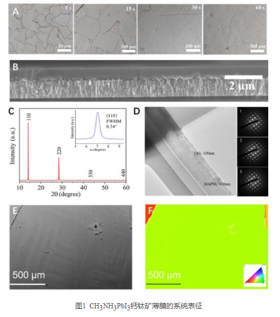 最近,課題組與天津大學(xué)科研人員合作,利用甲胺輔助重結(jié)晶方法原位制備CH3NH3PbI3鈣鈦礦薄膜,制備的鈣鈦礦薄膜厚度僅幾百納米,晶粒達(dá)到1-2 mm, 同時(shí)鈣鈦礦薄膜具有單一的(110)取向,他們利用SEM,XRD,TEM和EBSD對(duì)鈣鈦礦薄膜進(jìn)行系統(tǒng)的表征。制備的鈣鈦礦薄膜具有較低的缺陷態(tài)密度和較長(zhǎng)的載流子壽命,對(duì)應(yīng)的光伏電池光電轉(zhuǎn)化效率達(dá)到21.36%,該研究成果近日發(fā)表于Nat. Commun. (2020, 11:5402),通訊聯(lián)系人是蔣克健副研究員、宋延林研究員和天津大學(xué)周雪琴教授,第一作者是碩士生范昊宸和李鳳珠。