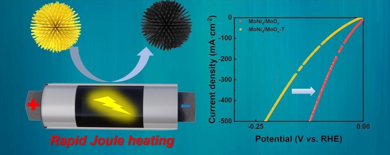 中國海洋大學(xué)孟祥超教授JMCA:焦耳熱快速加熱制備高效裂解海水析氫電催化劑. 【文章信息】 焦耳熱快速加熱制備高效Mo基電催化劑用于電催化裂解海水產(chǎn)氫 第一作者:趙展 通訊作者:孟祥超 單位:中國海洋大學(xué) 【研究背景】 環(huán)境污染和能源短缺危機(jī)促使人們開始關(guān)注可再生氫能源(H2)的研究。電化學(xué)海水裂解制氫已成為最有前途的制氫策略之一,以地球上豐富的W、Fe、Co、Ni、Mo等過渡金屬合理構(gòu)建電催化劑成為研究前沿。然而這些催化材料通常是由傳統(tǒng)的熱解法所制備,具有低效耗時且耗能的缺點。并且面臨著長時間加熱所導(dǎo)致的氧化,團(tuán)聚等負(fù)面影響。本文利用焦耳熱快速加熱制備出高性能析氫催化材料,通過60秒的加熱即可完成MoNi合金/氧化鉬復(fù)合材料的制備,可以有效地催化堿性海水介質(zhì)中的析氫反應(yīng)(HER)。 【文章簡介】 近日,中國海洋大學(xué)的孟祥超教授團(tuán)隊利用焦耳熱快速加熱合成的MoNi4/MoOx表現(xiàn)出了極佳的HER性能,僅需15 mV 的過電位即可達(dá)到 10 mA·cm-2 的電流密度,甚至在高電位下(1 A·cm-2)僅需227 mV,優(yōu)于傳統(tǒng)煅燒法合成的催化劑。這歸因于快速加熱所引起的催化劑形貌,Mo元素價態(tài)的變化以及快速加熱產(chǎn)生的缺陷。同時超快的加熱方法節(jié)省了大量的能源,加快了催化劑的制備速度。本文成果突出了焦耳熱快速加熱在開發(fā)用于電化學(xué)能源領(lǐng)域催化劑方面的獨特潛力。