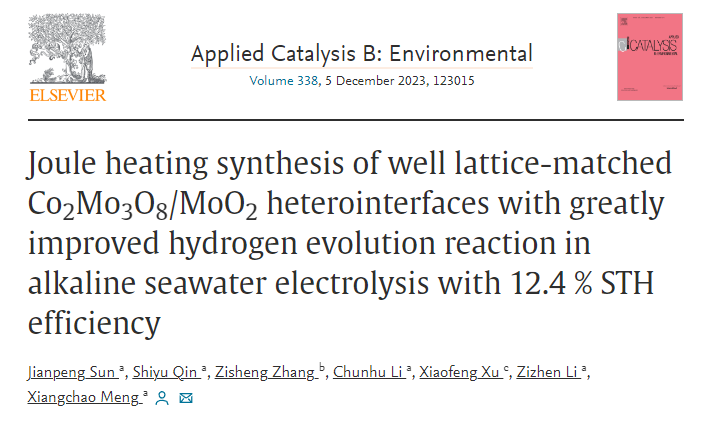 近日,中國海洋大學孟祥超教授科研團隊在JMCA和ACB期刊分別發(fā)表了題為“Rapid synthesis of efficient Mo-based electrocatalyst for the hydrogen evolution reaction in alkaline seawater with 11.28% solar-to-hydrogen efficiency”和“Joule heating synthesis of well lattice-matched Co2Mo3O8/MoO2 heterointerfaces with greatly improved hydrogen evolution reaction in alkaline seawater electrolysis with 12.4 % STH efficiency”的研究成果。